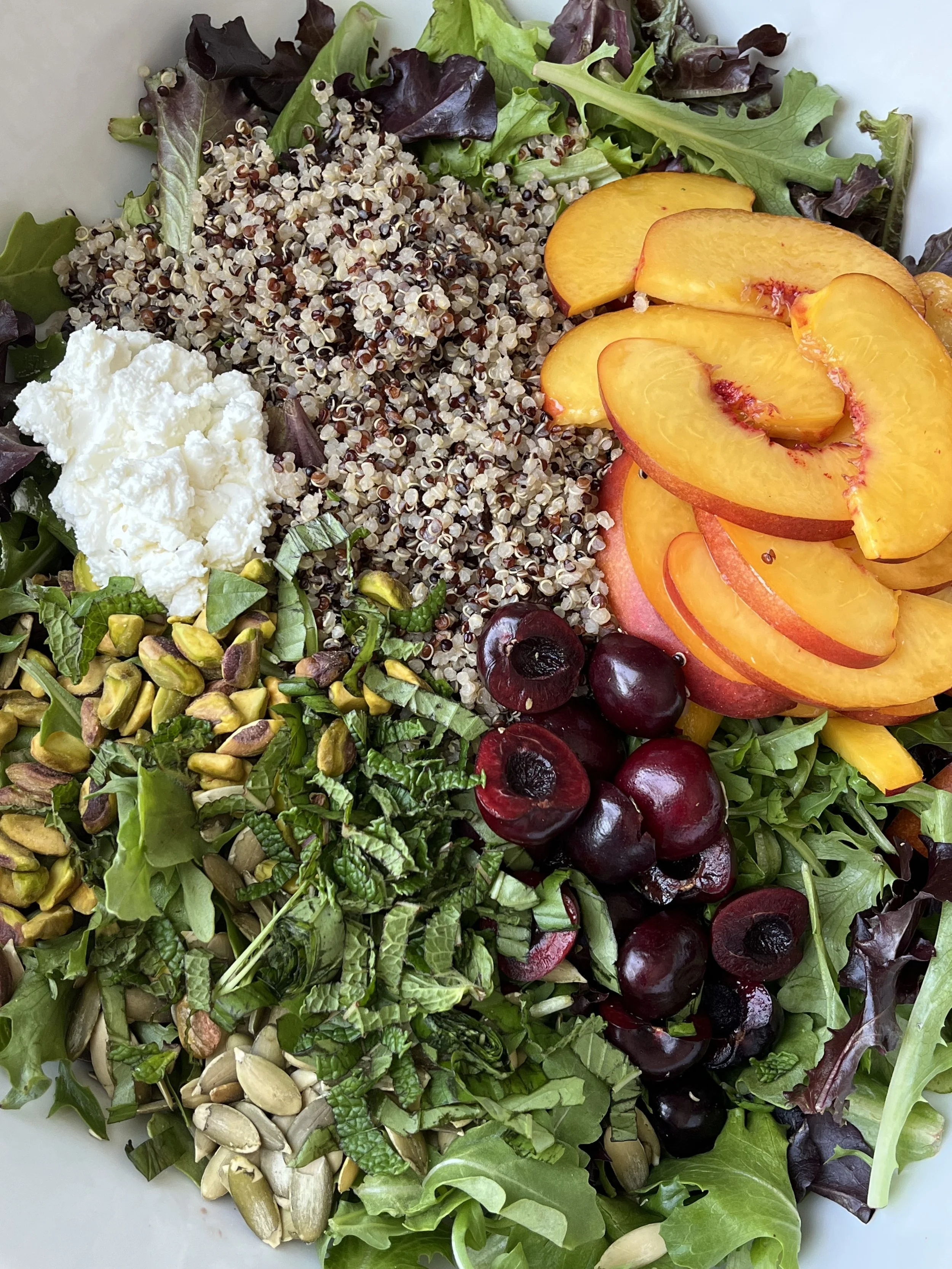 This salad is a crowd pleaser for your summer barbecues, graduation parties, and weekend pool hangouts. It has the perfect sweet hint from the cherries, peaches, and Just Date syrup. Many things can be swapped/omitted in this salad, but I highly suggest keeping the herbs as they taste incredible with the nuts and fruit!